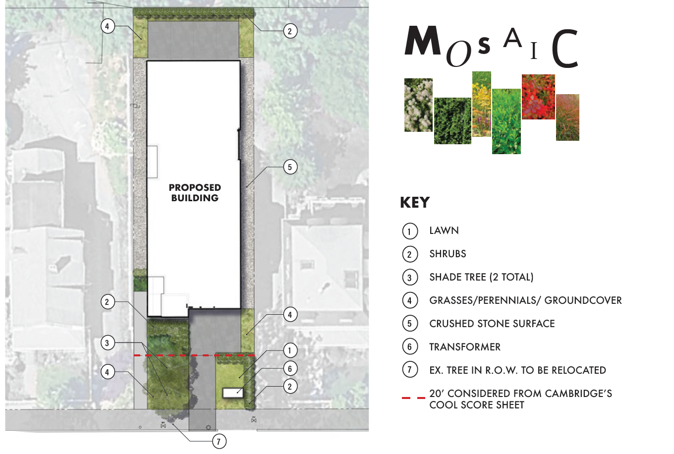 The planting design meets the requirements for the Cambridge Green Factor/ Cool Score. The planting concept is derived from a Mosaic that represents the intersection of the diverse landscapes of Cambridge. This Mosaic uses planting as a medium to craft the outdoor spaces, weaving together local ecological textures to define the character of the project.