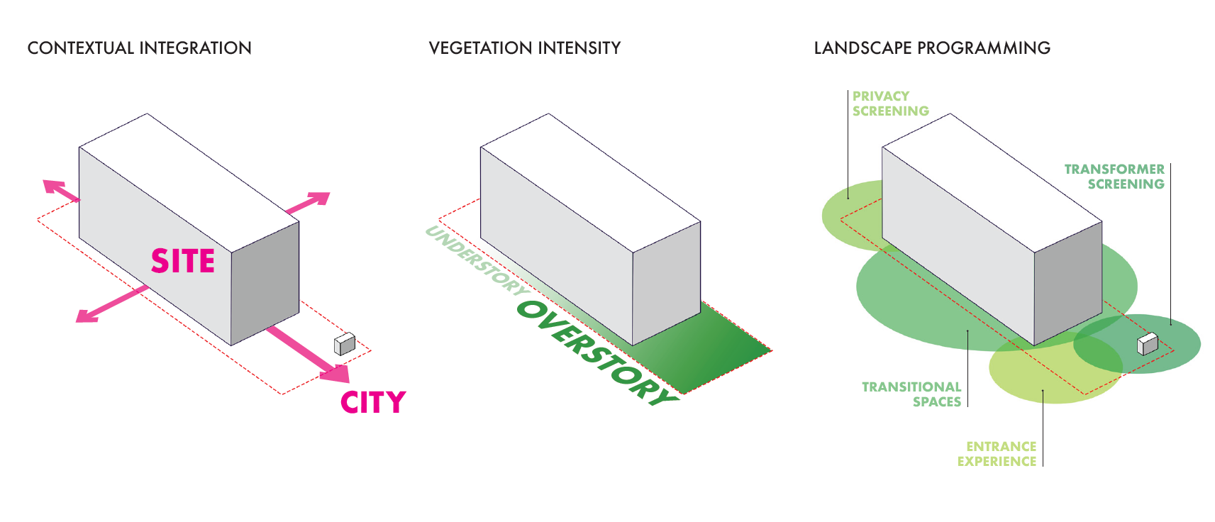 Complementing a compact three-story, nine-unit condominium, this landscape design navigates a narrow lot in North Cambridge. As the building occupies the majority of the site, landscape treatments are proposed intensively along the street frontage to elevate the streetscape and the resident arrival experience.